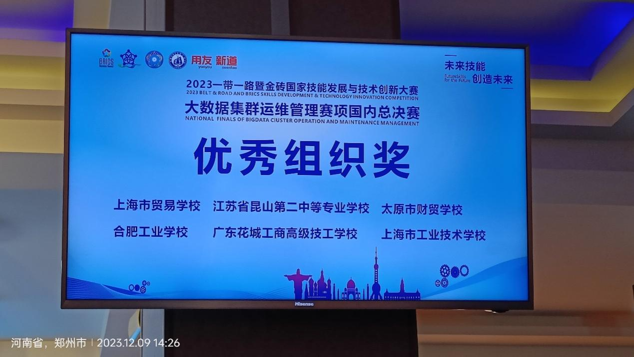 12月9日,2023一带一路暨金砖国家技能发展与技术创新大赛“大数据集群运维管理赛项”国内总决赛(中职组)在郑州市电子信息工程学校举办,我校王浩、陈文龙、朱梦茹(均为21高职5班)获得团队二等奖,魏飚、童亚运获得优秀指导教师,合肥工业学校获得优秀组织奖。本次比赛由线上全国选拔前三十名队伍参加线下决赛。