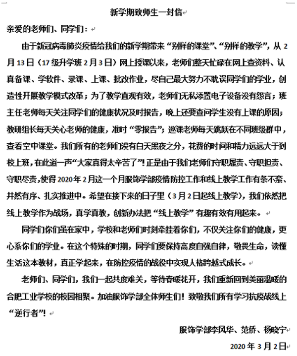 2020年庚子新春,一场突如其来的疫情,延缓了新学期开学步伐,为了把疫情对同学们的学业影响降到最低,服饰学部广大师生认真贯彻落实《安徽省中等职业学校线上教学工作指南(三)》的通知精神,根据学校《新冠肺炎疫...