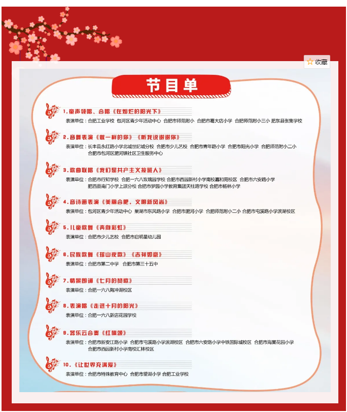 为庆祝中国共产党成立99周年,7月1日,由合肥市教育局、市文明办联合主办的“童心向党,童梦飞扬”线上歌咏展示活动正式上线,合肥工业学校选送的《在灿烂的阳光下》和《让世界充满爱》二首曲目双双入围,分别作为所...