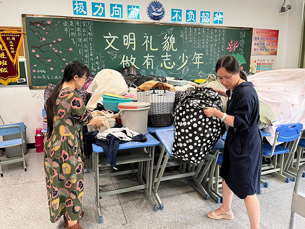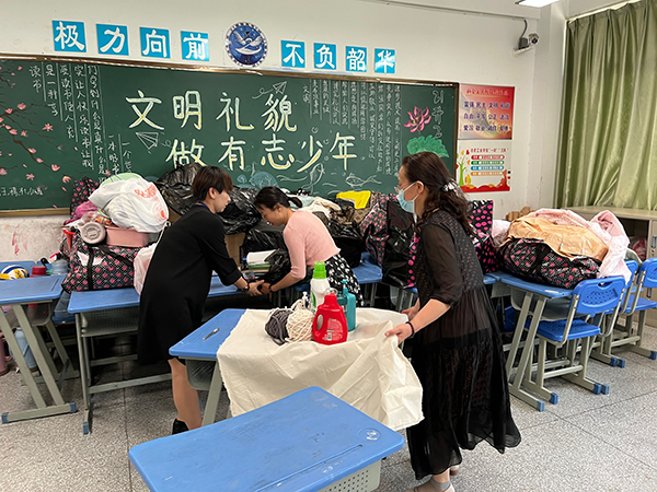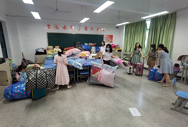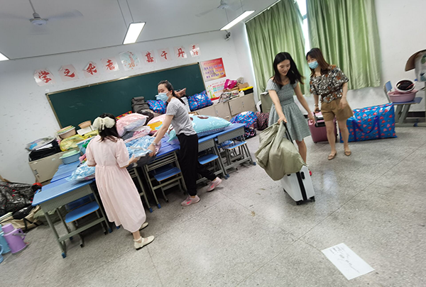 党员们在整理和搬运学生物品过程中轻拿轻放,确保学生物品不遗漏、不损坏,对学生负责。搬运现场,党员老师们不分年龄大小、不分男女,都积极参与到搬运工作中。老师们有的爬到桌子上往下放行李、有些抬着重重的行李往外运、有的拿着垃圾袋清理剩余的纸屑垃圾,检查是否把有用物品混合在此……那认真细致的态度,比为自己的孩子整理行李还细心。