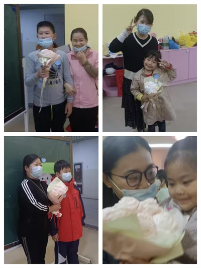 21绘画普专3班同学们将之前班级活动中全班同学一起制作的象征团结、友爱、幸福的花束交给了游戏获奖的小朋友们,孩子们的笑脸在鲜花的映衬下显得格外灿烂,这一束束的鲜花及一张张的笑脸给封闭中的校园带来的一抹明亮的色彩。