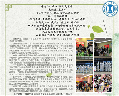 作为团支书的王倩倩同学代表21绘画普专3班在疫情防控期间参与主题团日活动的十几位同学发表了她的感言。就像她说的“疫情无情人有情,隔离不隔爱。我们用自己的行动筑起欢乐的城堡,为封闭的环境里增添一抹彩虹。我相信,只要我们团结一心,彼此鼓励,互相携手营造美好氛围,我们期待的明天终会如期而至!”
