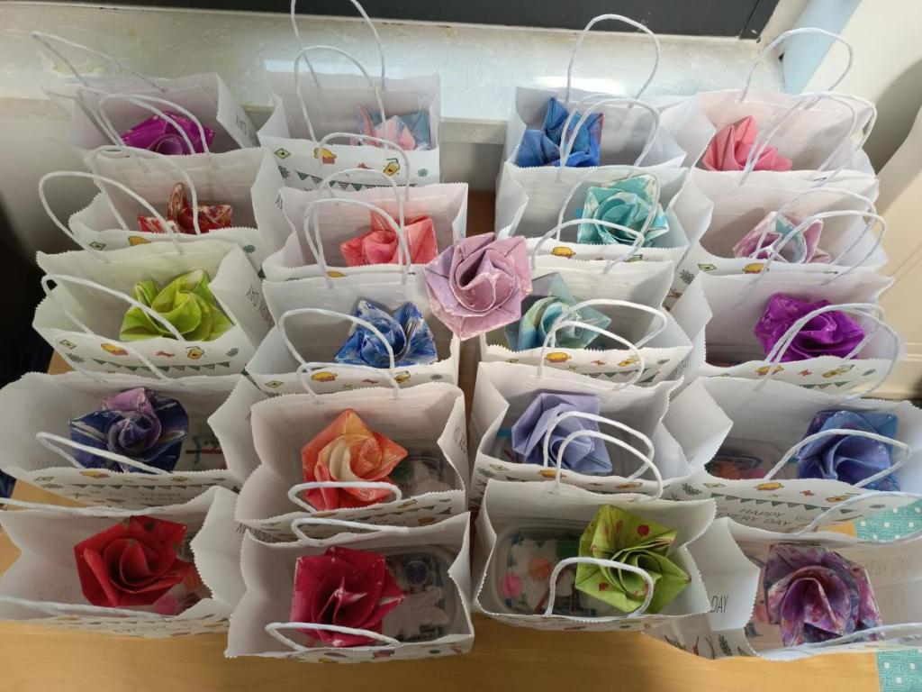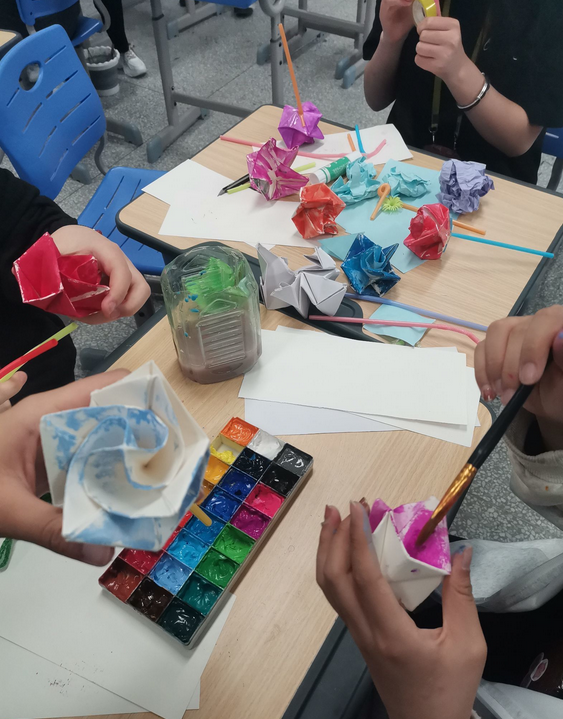 同学们在班级体育委员的带领下学习利用素描纸折叠玫瑰花的方法,尽管素描纸比一般纸张硬的多,扭转时非常不方便,甚至还有不少同学第一次尝试时纸张直接裂开,但是同学们还是学的很认真,发挥坚持不懈精益求精的工匠精神不断学习、尝试,最终每位同学都能够制造出几朵花朵。接着他们利用平时上课的颜料并发挥自己的想象与个性给花朵渲染上了美丽的色彩。朵朵鲜花堆放在一起宛如一个大花园,是那么的绚丽那么的富有朝气,就如青春期的他们又如活力四射的儿童。