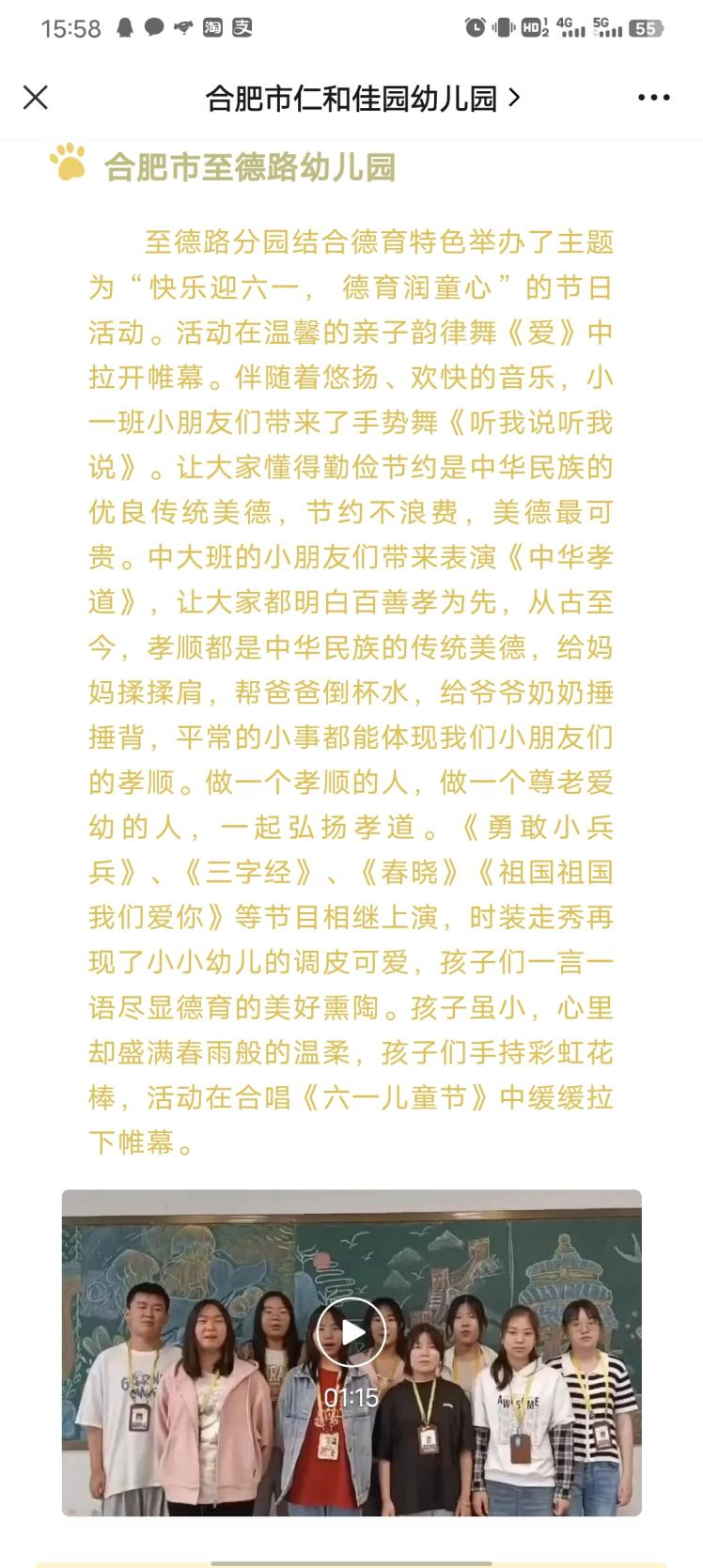 幼儿园的领导、老师以及家长对于此次活动给予高度的肯定与赞扬。同学们祝福的视频更是登上了幼教集团的官方微信。让爱在学校之间、学生之间传递。这是21绘画普专3班的同学们在用他们的专业技能践行社会责任,用专业特色服务社会,用工匠精神打造孩子们快乐的六一。