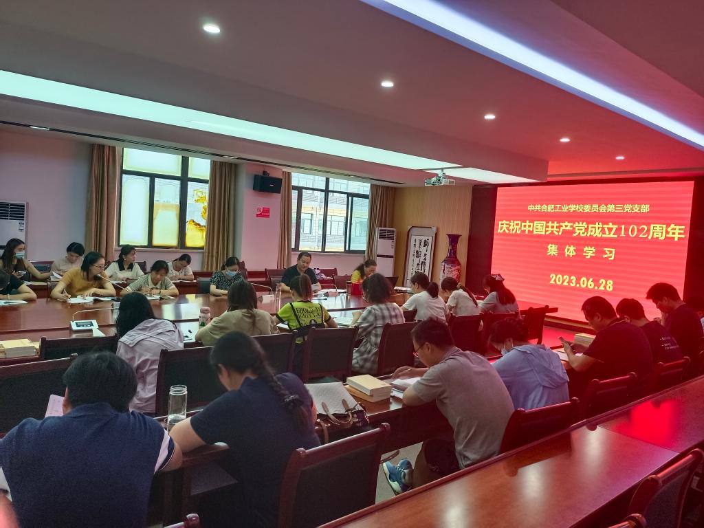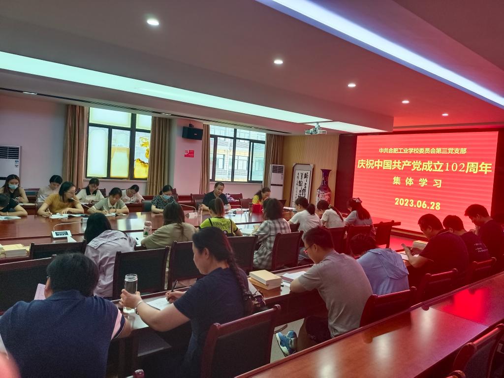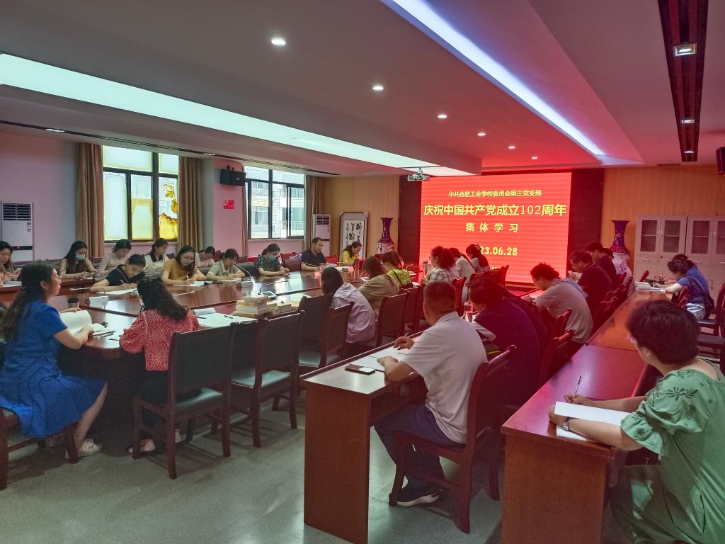 邓传国同志宣读了中共合肥工业学校委员会《关于组织开展庆祝中国共产党成立102周年系列活动的通知》,带领党员学习了《深入学习宣传贯彻习近平总书记在中央政治局第五次集体学习时重要讲话精神的工作方案》。宣传委员曾亚琴带领全体党员学习了《习近平新时代中国特色社会主义思想专题摘编》第18章:坚持不懈用新时代中国特色社会主义思想武装头脑、指导实践、推动工作。
