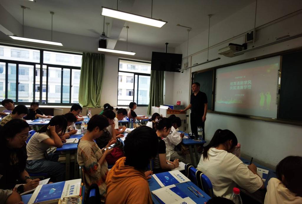 5日上午,第三党支部书记邓传国在服饰学部23服装2班开讲,他从让学生写“清”说起,讲述清字组词、书法,介绍中华传统文化、名人故事,并结合学校实际,为广大青年学生带来了一堂关于清廉学校建设、打造清新学风的生动课程。
