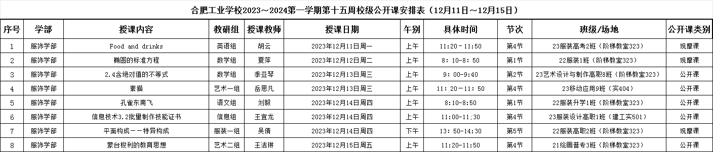 2023-2024第一学期第十五周校级公开课安排