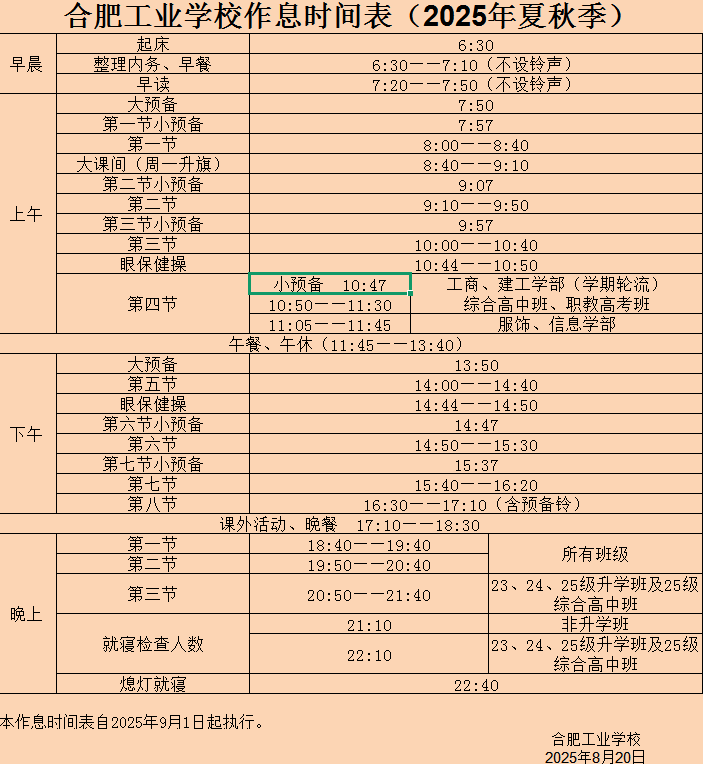 2025年夏秋季作息时间表