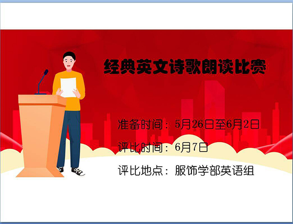 为了激发学生学习英语的热情,特别是提高对英语口语训练的积极性。近日,服饰学部英语组举办了英文诗歌朗诵比赛,评委老师由服饰学部英语组全体教师担任。