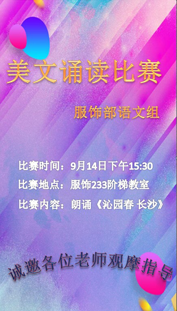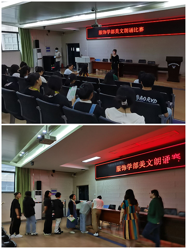 2022年9月14日下午,服饰学部语文组在阶梯教室举办了以毛泽东《沁园春·长沙》为题的美文诵读比赛。来自各班级选拔的32名选手参加了美文诵读,经过语文组教师的现场评判,22服装1班的忽佳琪等5名同学夺得一等奖,21绘画高职6班的王琪等7名同学获得二等奖。