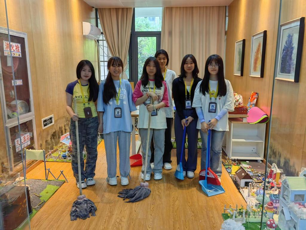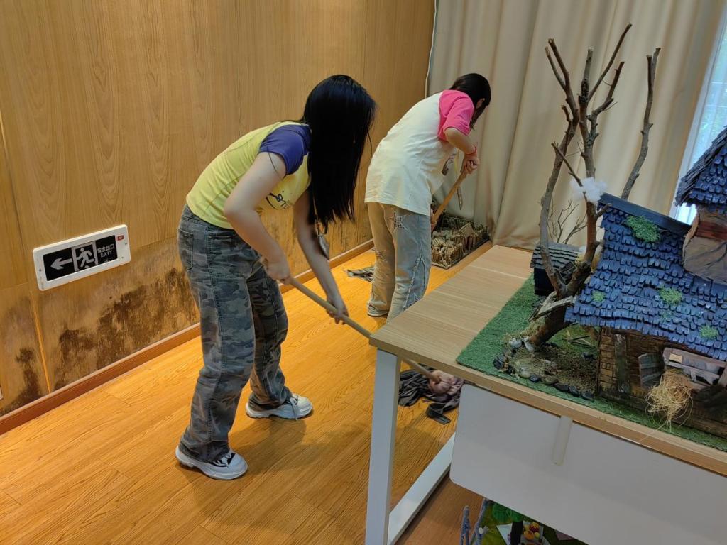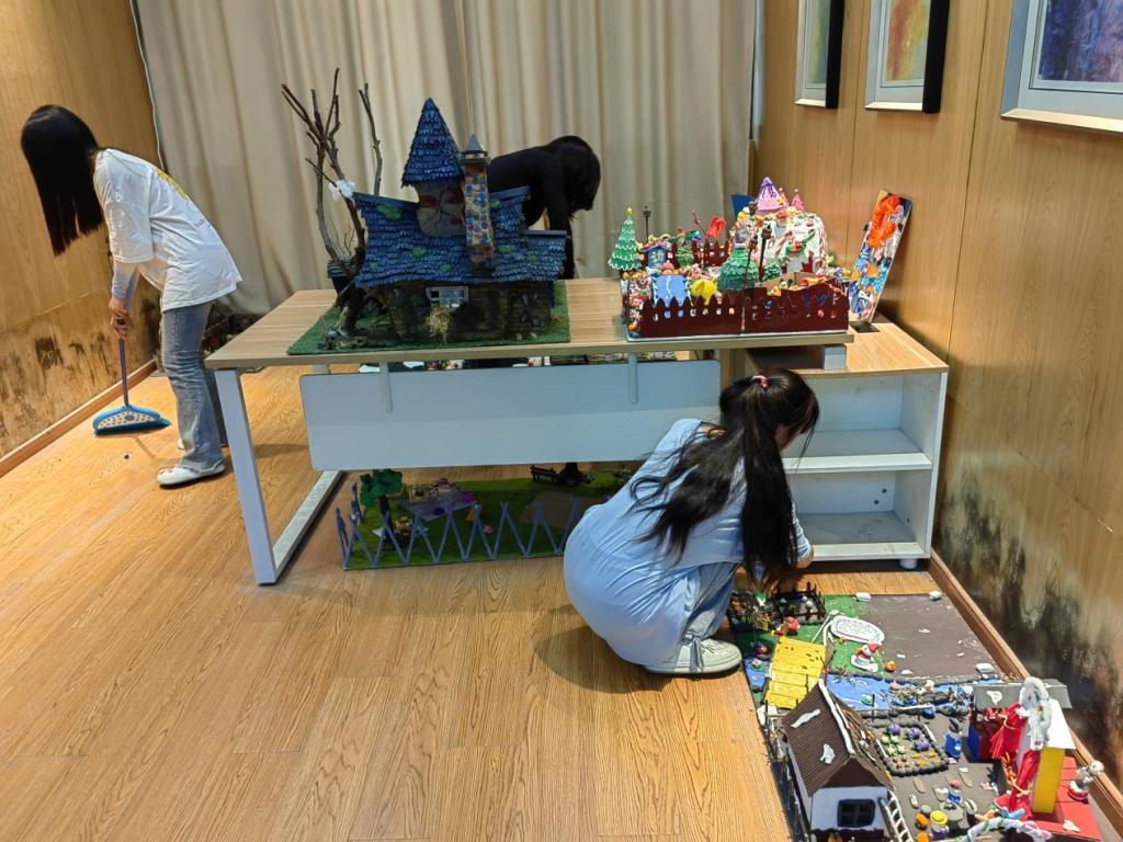 欣赏完黏土作品,同学们开始准备大扫除了。她们首先小心翼翼地将展厅内的黏土作品抬出来,摆放在走廊。然后分工合作,有的擦桌子、有的扫地、有的拖地,不一会儿功夫展厅就被打扫地干干净净,在灯光的照耀下闪闪发光。结束后,同学们将作品搬回展厅,整齐地摆放起来。看着整洁明亮的展厅,她们收获了满满的成就感。