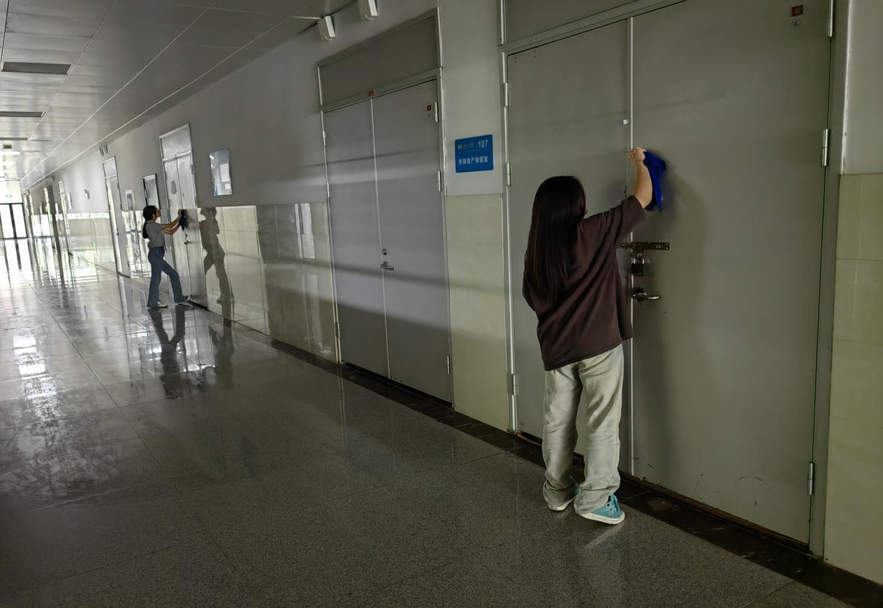 另一组的刘欣怡和陈晓语同学则承担了检查一楼到四楼实训室门贴的重任。她们带着抹布将实训室门上遗留的的门贴痕迹擦得干干净净。