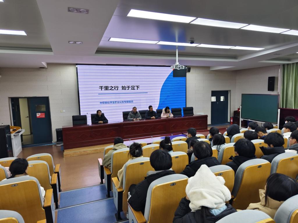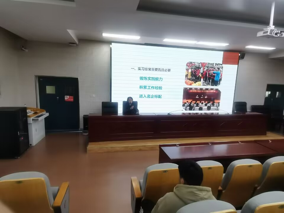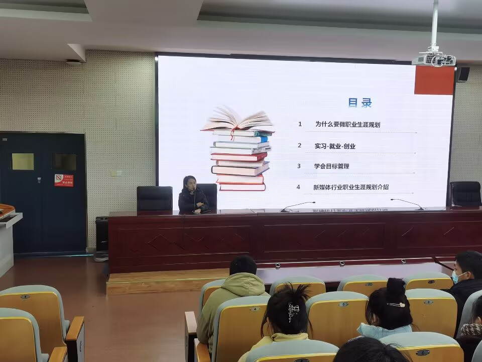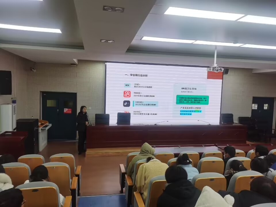 首先,她结合自身创业的经历介绍了职业生涯规划与职业成就的关系,对选择实习和就业单位以及提升求职能力提出了切实可行的建议,并以新媒体行业为例分享如何进行职业生涯规划。随后,她分享了第25届“安徽青年五四奖章”获得者贾亮的故事,讲述了贾亮从学徒工成长为汽车钣金与涂装国家技能大师的事迹。最后,她简要介绍了安徽抖持文化传媒有限公司,为即将毕业的学生们提供了实习岗位。