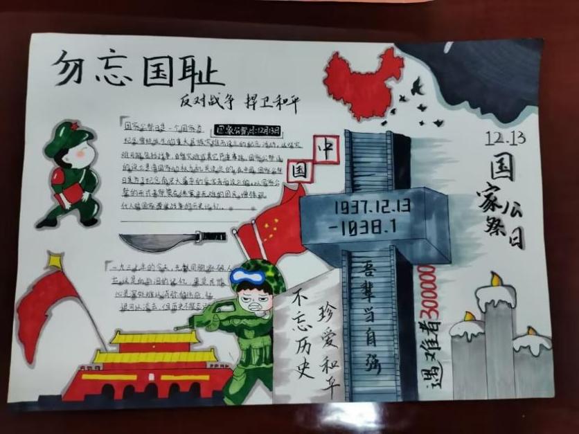 观影活动点燃了学生们的创作激情,他们纷纷组队绘制国家公祭日纪念海报,或画图寄托哀思、或写字抒发情感,一笔一画尽显团队创意,饱含着对死难同胞的深切悼念之情,表达了不忘国耻、吾辈自强的拳拳爱国之心。