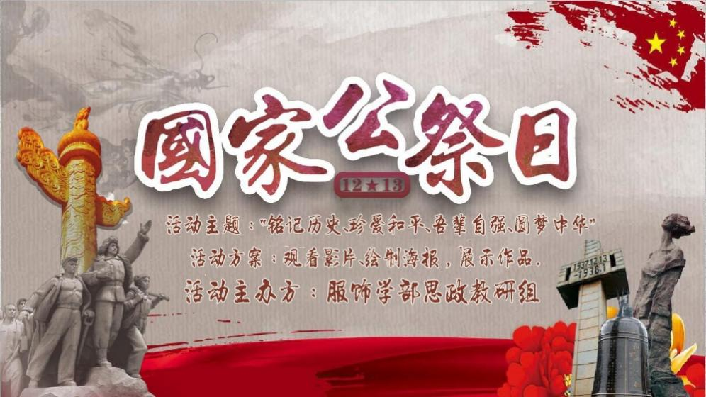 2023年12月13日第十个国家公祭日到来前夕,为了让学生们能深刻铭记历史教训,珍爱来之不易的和平,深植爱国情怀、践行报国之志,近期,服饰学部思政组的老师们广泛动员宣传,组织策划了一场主题为“铭记历史、珍爱和平、吾辈自强、圆梦中华”的国家公祭日系列悼念活动。