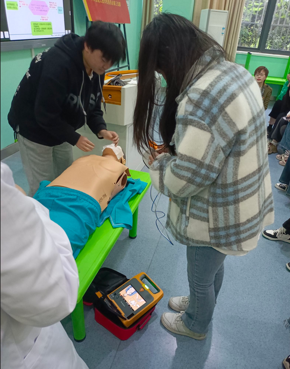 本次活动中,同学们认识到了黄金五分钟的重要性,学习了胸外按压加人工呼吸相互配合的频率,掌握了按压的部位和姿势以及人工呼吸前的开放气道进行下一步操作时机分辨,还有AED除颤的使用及其注意事项。我们在白衣天使的带领下益匪浅医生们的提问环节我们也是对答如流。这些知识与如此详细的指导都十分宝贵。因此,在医生姐姐进行实践操作时,我们目不转睛的盯着,全神贯注的聆听。
