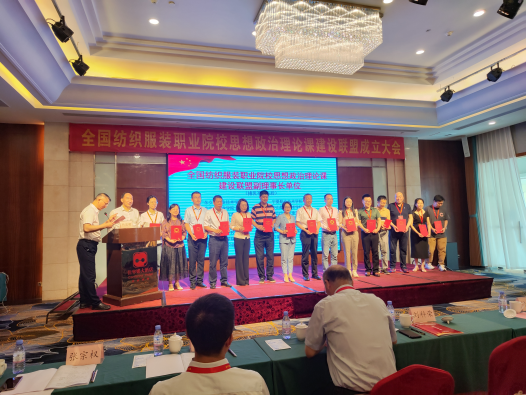 6月3日,全国纺织服装职业院校思政课建设联盟成立大会暨思政课教师研修基地培训会,在广东职业技术学院举行,来自全国各地的39所职业院校代表参加。大会进行了揭牌仪式,审议了全国纺织服装职业院校思政课建设联盟章程,选举产生了首届理事会和秘书处组成人员,颁发了联盟理事长单位、副理事长单位的证书。我校当选全国纺织服装职业院校思政课建设联盟副理事长单位,党委委员、副校长张宗权参加了授牌仪式。