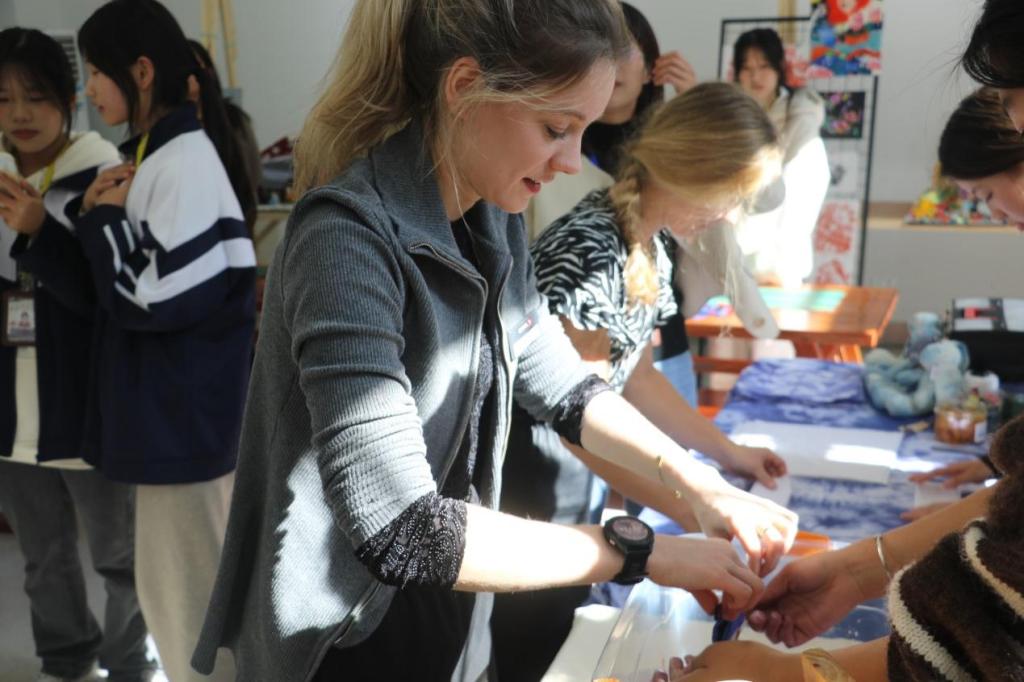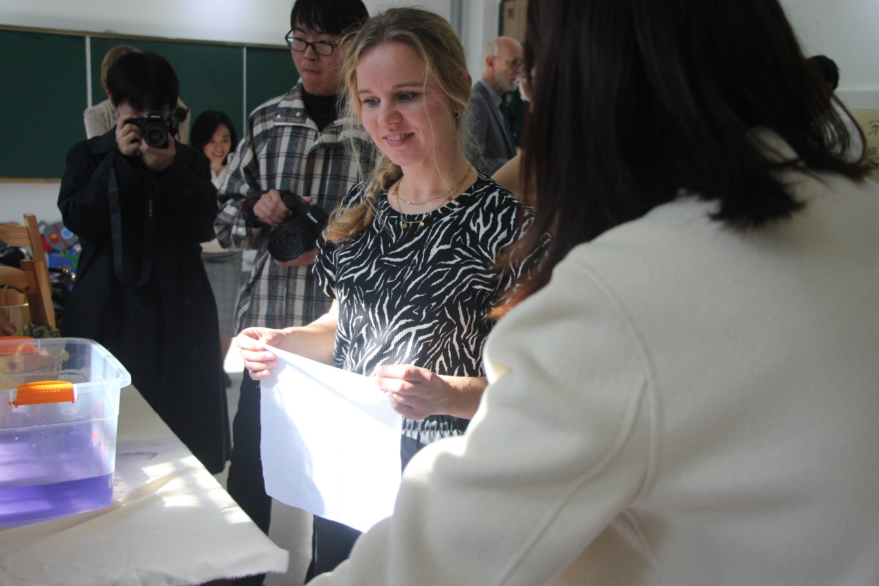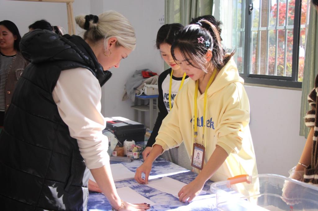 学部精心安排的剪纸、扎染、书法互动体验活动引起了交流团对中国传统文化的浓厚兴趣。他们来到扎染社前,社团师生介绍了扎染艺术以及扎染使用的材料,并现场展示了扎染的方法和步骤,交流团在社团师生的指导下体验了扎染这项古老的染色技艺并现场染出了精美的图案。