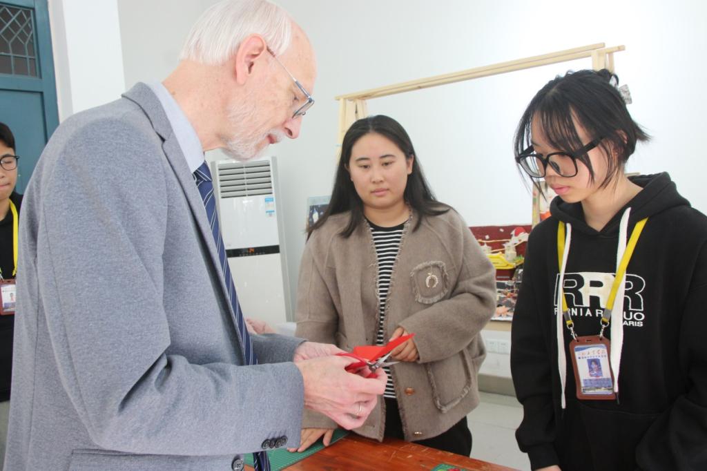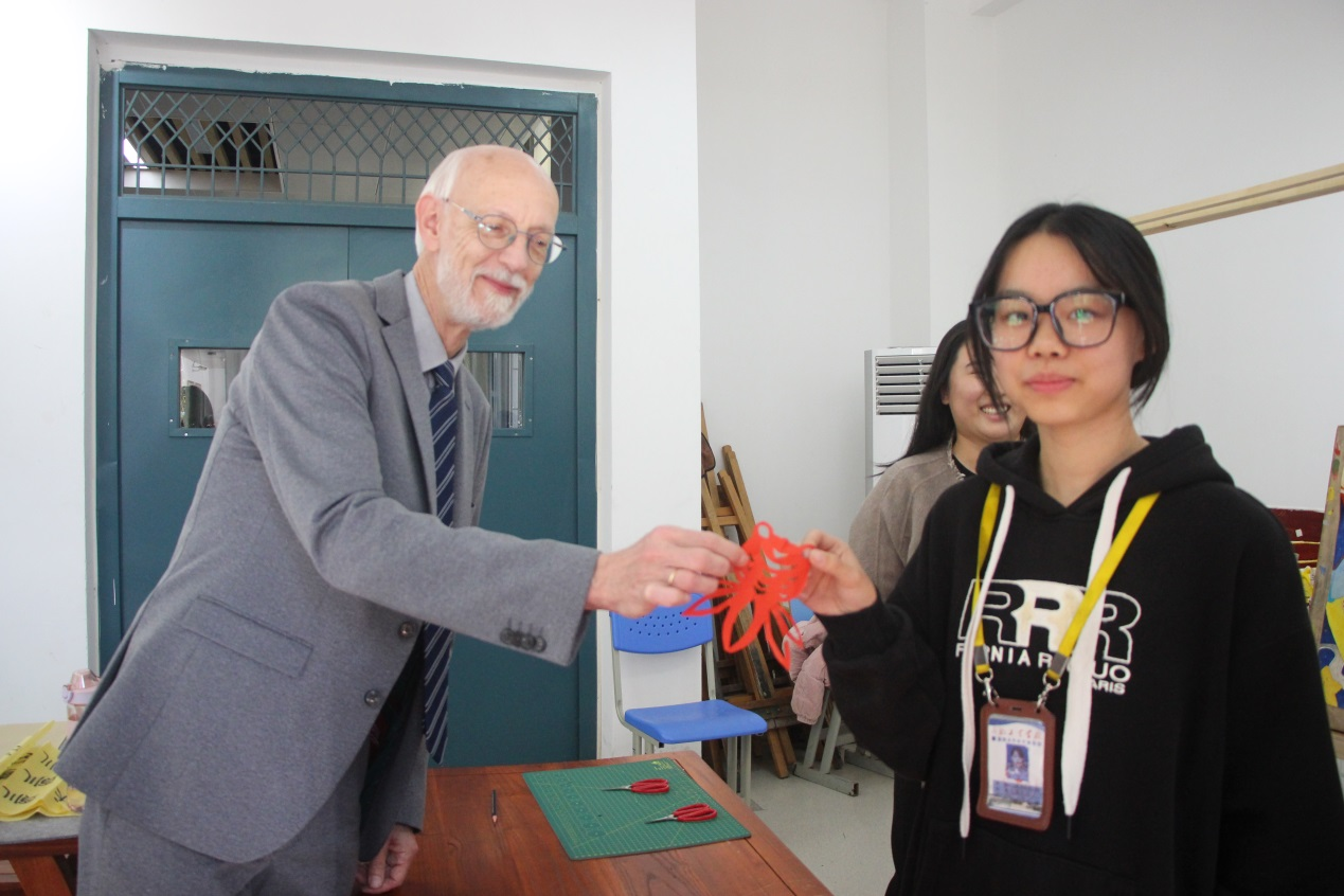 最后,学部剪纸社和服饰品制作社准备了福娃剪纸作品和盘扣作品,作为礼物赠送给交流团,望中国传统文化能走出国门,架起我校与德国诺特海姆第一职业学校沟通交流的桥梁。