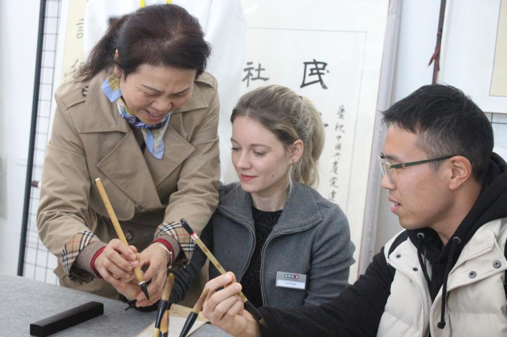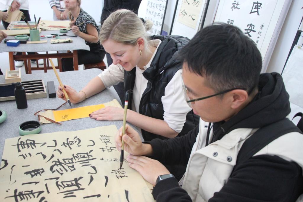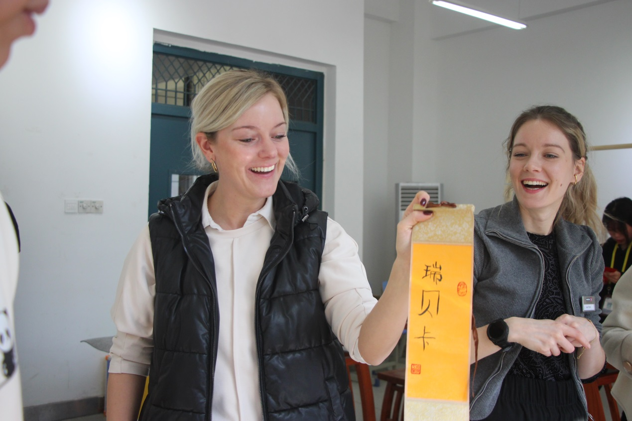 剪纸是中国民间古老艺术之一,作为一种镂空艺术,它能给人视觉上以透空的感觉和艺术享受。在剪纸社师生简单介绍之后,德国友人们纷纷拿起剪刀尝试着剪纸,一副副美丽的剪纸作品让现场师生赞叹不已。在书法社前,德国友人们跃跃欲试,拿起笔,蘸墨,兴高采烈地写下属于自己的中文名字。