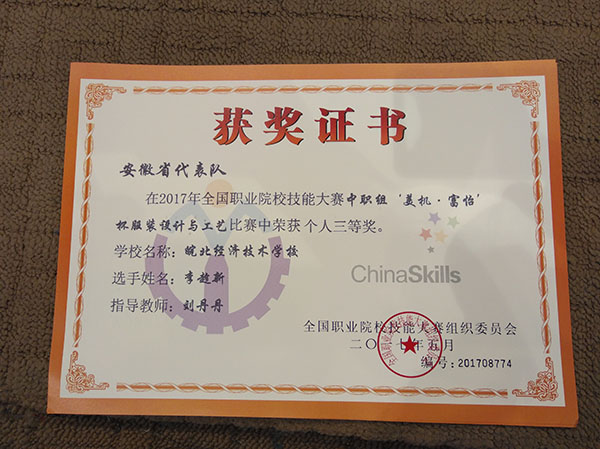5月22日下午,从苏州高等职业技术学校全国职业院校技能大赛赛场获悉,在刚刚结束的服装设计与工艺项目国赛中,合肥工业学校服装与文化艺术学部的郭文霞、李肖艳两位同学不畏强手,沉重应战,经过17.5个小时的激烈角逐,荣获1银、1铜佳绩,该学部还为皖北经济技术学校代为培训的王珍珍、李趁新两位同学同时荣获两铜好成绩,获奖率100%,四位同学同时站在全国职业院校技能大赛颁奖仪式领奖台上,为安徽省、合肥市争夺了荣誉,为学校争了光。