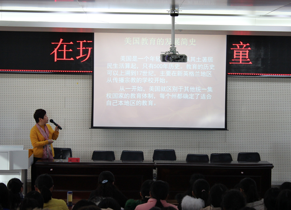 2017年12月17日上午,宿州路幼儿园阮琴园长在合肥工业学校服饰学部233阶梯教室为学前教育专业教师们以及2015级学前教育同学们开展了题为“感受美式教育追寻人文足迹”的专题讲座。作为研究学前教育的专业人物,阮园长向我们大家介绍了去年参观美国职业高中的亲身经历,以及中美职业高中在学习方式和教育理念的差别,并且用一张张生动的照片向我们展示了美国职业高中学生在课堂和课外学习方面的自由、平等的氛围。