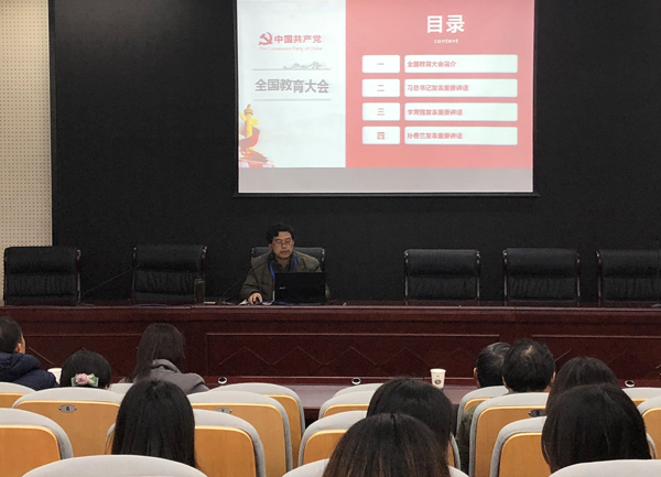 曹文华以“全国教育大会简介”、“习近平总书记发表重要讲话”、“李克强总理发表重要讲话”、“孙春兰副总理讲话精神”四个篇幅展开宣讲,详尽解读了全国教育大会精神,阐明了全国教育大会的重大现实意义和深远历史影响,他鼓励参会人员认真学习、深刻领会,将全国教育大会精神贯彻到工作中、落实到行动中,做好新时代的人民教师。