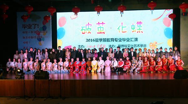 学前教育专业师生精彩华美的展示活动赢得了来宾及全校师生的热烈掌声。在男女对唱《共筑中国梦》的感人旋律中,汇报活动宣布结束,来宾及校领导共同与演职人员进行了合影留念。