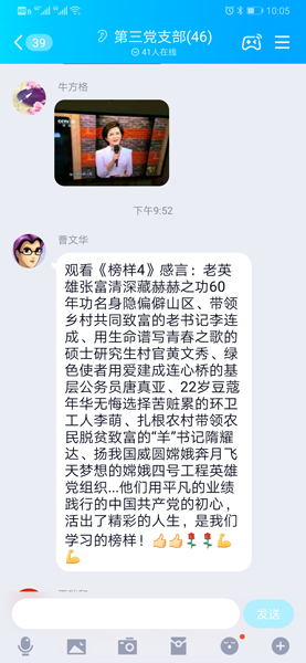 《榜样4》专题节目聚焦“不忘初心、牢记使命”主题,通过张富清、李连成、黄文秀、唐真亚、李萌、隋耀达以及嫦娥四号工程党组织代表叶培建、孙泽洲、刘适等人物的典型事迹再现、集中彰显优秀共产党员坚定信仰、担当作为、服务群众、无私奉献的精神风貌,深刻诠释中国共产党人“不忘初心、牢记使命”的执着坚守。第三党支部全体党员同志在观看过程中深受触动,抑制不住内心的感动,纷纷自发通过QQ党务工作群交流观看感言,例如:“向榜样学习,不忘教育初心”、“榜样力量感天动地”、“无私奉献,敢于担当”……