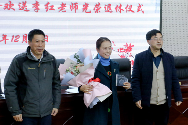 “一个人一生做好一件事不容易”曹文华副校长总结致辞,“李红老师为我们做出一个好的榜样,她是一个与人为善,做事执着,乐于奉献的人,执着追求的工作态度值得我们学习。”他希望李红老师奉献余热,并祝愿她永葆年轻,生活幸福!随后曹文华副校长和张宗权副校长为李红老师送上的鲜花和纪念品。