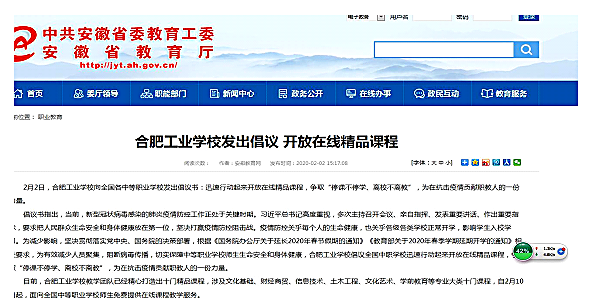 党委委员曹文华靠前指挥,组织全校教学骨干开设网络在线课程, 2月2日,合肥工业学校10门在线精品课程同时上线。主持制定《合肥工业学校在抗击新型冠状病毒感染的肺炎期间开展在线课堂实施方案》,协调组织网络直播技术培训,指导学部落实教学计划,实现2020届职教高考班线上直播空中课堂按时开学,确保“停课不停学、离校不离教”。