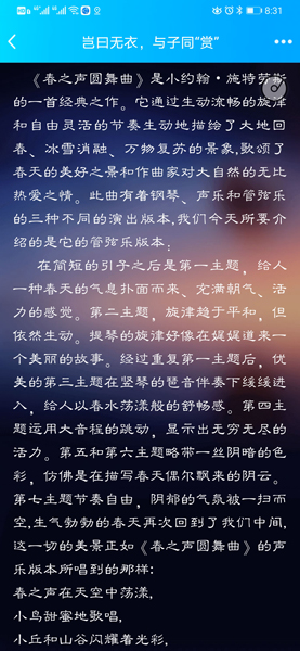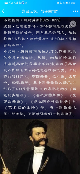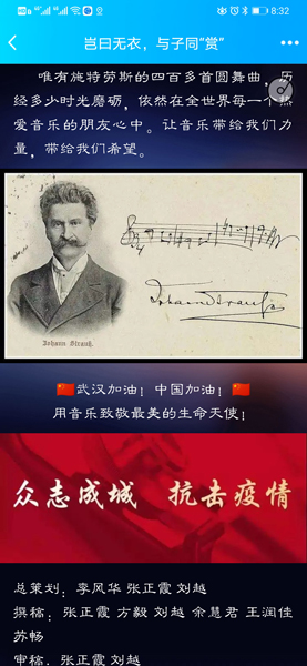 音乐鉴赏美篇中,编辑了施特劳斯家族的《蓝色多瑙河圆舞曲》、《春之声圆舞曲》等优秀音乐作品,展示了人类最文明、最积极的一面,让我们带着音乐的激情与爱国热情一起直面,共抗疫情。