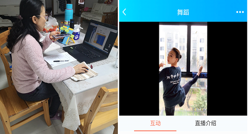 在上课过程中,有的老师手机和电脑齐上阵相互配合使用,舞蹈老师更有创意,把自家阳台作把杆。