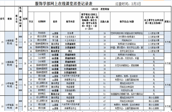压实管理,空中巡课别具一格。首先制定巡查人员安排表,每人负责4-5个班级,线上教学之后,巡课老师全天坐在电脑前,跳跃在不同的班级群、不同的教师空中课堂、不同的软件平台,每天坚持6节课,还要“记录学生上课人数、上课内容、教学情况、教学亮点及存在问题”等,及时反馈给老师和班主任。一天下来可谓人人眼花头昏,但没有人叫苦叫累,心存坚定信念,一定会攻克时艰。