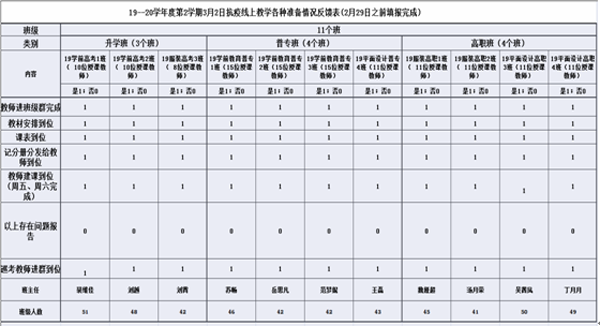 制定工作任务表,督促“线上教学”各项工作是落实到位。从班级侧面检查 “教材、课表、记分册、教师网上建课堂、授课教师和巡课教师进班级群” 等方面于2月29日一一落实到位。