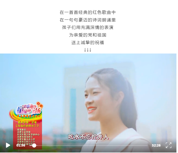 为庆祝中国共产党成立99周年,7月1日,由合肥市教育局、市文明办联合主办的“童心向党,童梦飞扬”线上歌咏展示活动正式上线,合肥工业学校选送的《在灿烂的阳光下》和《让世界充满爱》二首曲目双双入围,分别作为所有展示节目的片头曲和片尾曲惊艳亮相,尽显我市中职少年的青春风采。