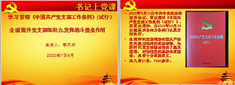 7月9日下午,为学习贯彻《中国共产党支部工作条例》(试行)全面提升党支部组织力,发挥战斗堡垒作用。由第三党支部书记李风华主讲,全体与会党员在服饰学部三楼阶梯教室认真聆听专题党课,并认真记录。校党委书记王靖、党委委员曹文华以普通党员身份参会。