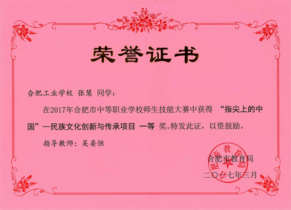 社团学生的作品《澜》和《月晕相思起》曾分别荣获2017年合肥市中等职业学校技能大赛“指尖上的中国”——民族文化创新与传承项目一等奖和二等奖,在为我校争得荣誉的同时,也对非遗文化做了一个很好的传承。