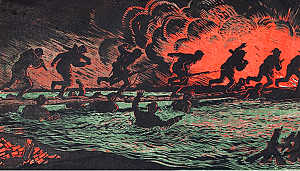 不仅仅是现在,早在鲁迅先生不遗余力的倡导中国新兴版画运动的时候,中国的版画家,就拿起刀,在木板上雕刻自己的爱国情怀,激发国人的抗战爱国之心。如李桦《怒吼吧,中国》、古元的《人桥》、胡一川《到前线去》、黄新波《卖血后》等等等等。