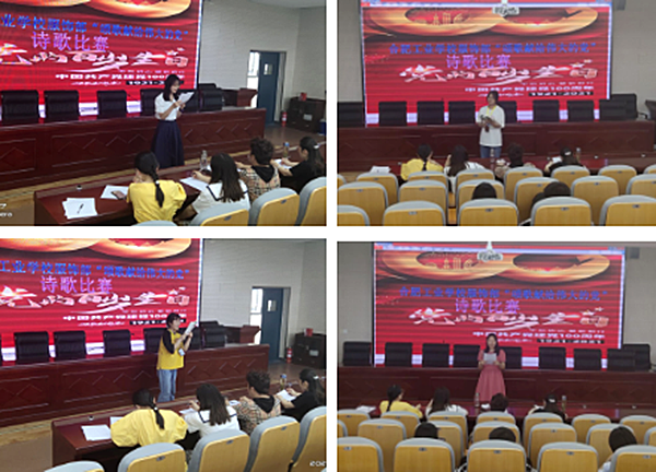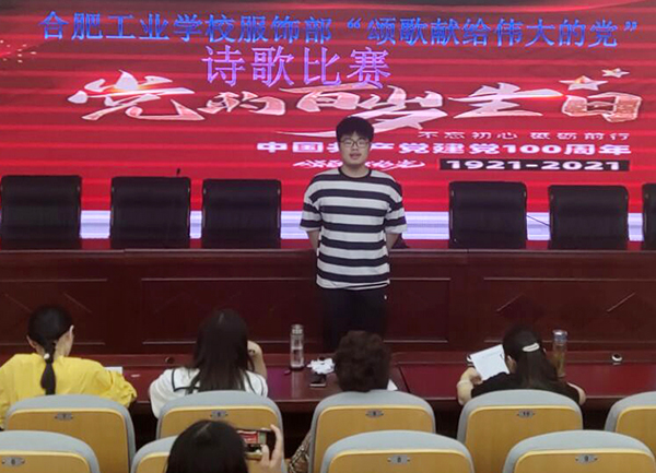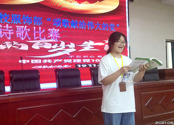 为庆祝中国共产党成立100周年,讴歌100年来中国共产党领导中国人民取得的伟大成就,增强同学们对伟大、光荣、正确的中国共产党的认识,为丰富校园文化,提高学生诗歌朗诵水平,根据期初教研安排,2021年6月8日下午,服饰与文化艺术学部学部语文组在学部323教室举行主题为“颂歌献给伟大的党”诗歌朗诵比赛。来自学部各班级推荐的选手参加比赛。