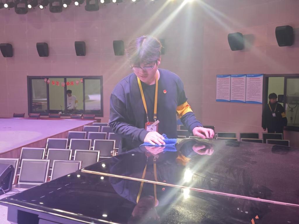 针对这一情况,学生会迅速召开专题会议部署工作,主席团牵头制定方案,将成员划分为地面清洁组、设施擦拭组、道具整理组、死角攻坚组,明确分工、压实责任。活动现场,成员们精神饱满、热情高涨:地面清洁组全方位清扫并重点攻克顽固污渍,设施擦拭组细致擦拭各类设备设施,道具整理组规范归置各类物品,死角攻坚组集中清理积尘杂物。大家分工协作、不怕脏累,发扬吃苦耐劳、团结协作的优良作风,经过近两小时辛勤劳作,展演大厅环境面貌显著改善,整体焕然一新。
