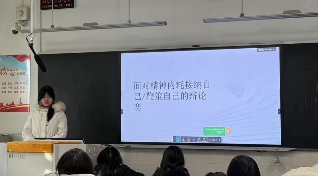 近日,24高职9班开展了一场别开生面的成长主题辩论赛。活动以“接纳自我与鞭策自我”为辩题,通过学生自主组队、师生共议的形式,将“精神内耗”这一成长课题转化为可触摸、可实践的成长智慧,在思辨中探索自我成长的平衡之道。