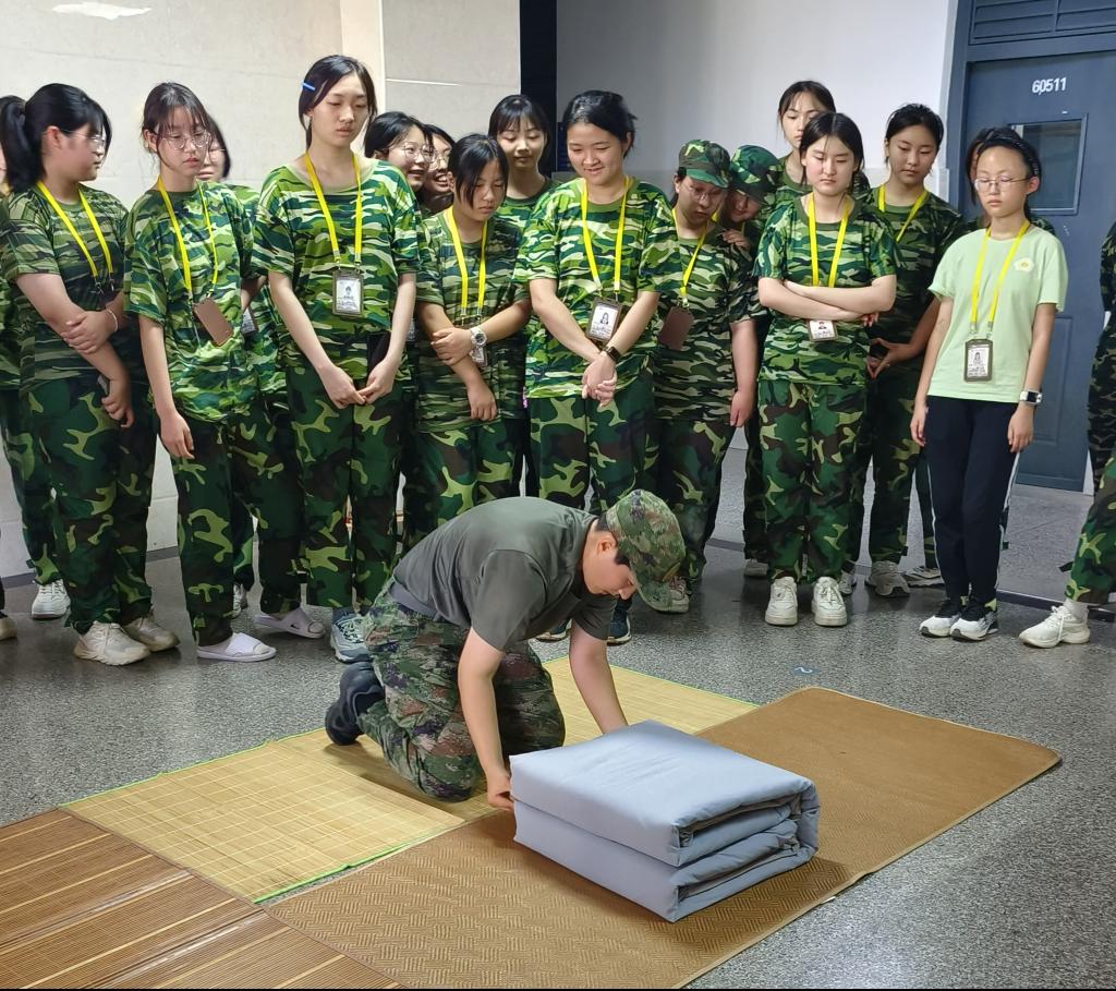 在宿舍楼宽敞明亮的大厅内,军训的内务培训正在紧张而有序地进行着。身着迷彩服的学生们围聚在中心,他们的目光聚焦在正专注地展示着如何将被子叠成整齐的“豆腐块”形状的教官身上。学生们纷纷投去赞许的目光,并迫不及待地想要亲自动手尝试。