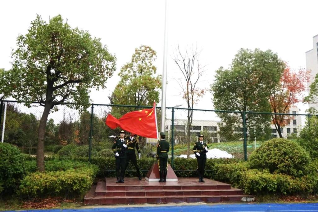 在升旗仪式中,全体师生肃立,升国旗、奏唱国歌。鲜艳的五星红旗在激昂的国歌声中缓缓升起,飘扬在学校田径场上空。