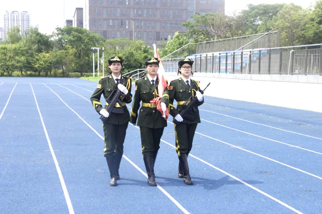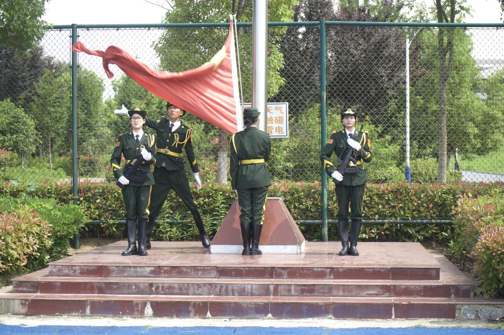 国旗护卫队的同学们迈着整齐划一、铿锵有力的步伐,护送着五星红旗正步走向旗杆。全体师生面向国旗肃立致礼,随着激昂的《义勇军进行曲》响起,师生们注视着五星红旗冉冉升起,在熠熠晨光中迎风飘扬。