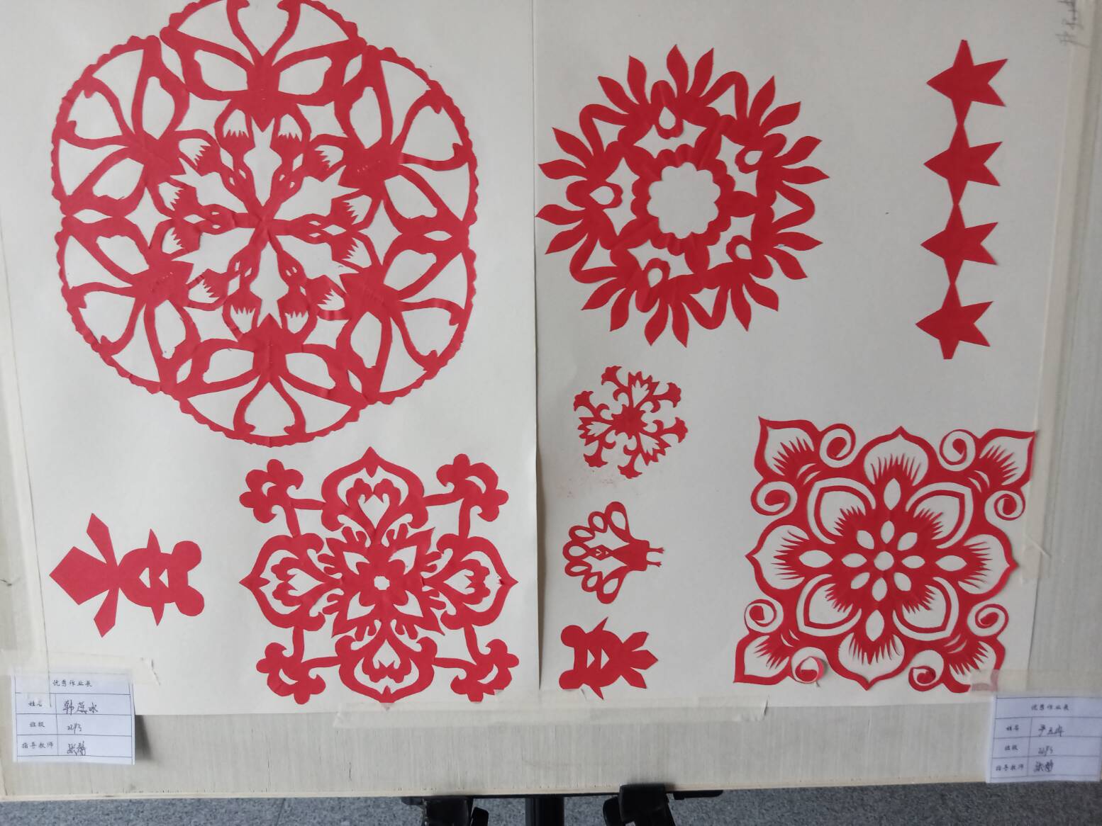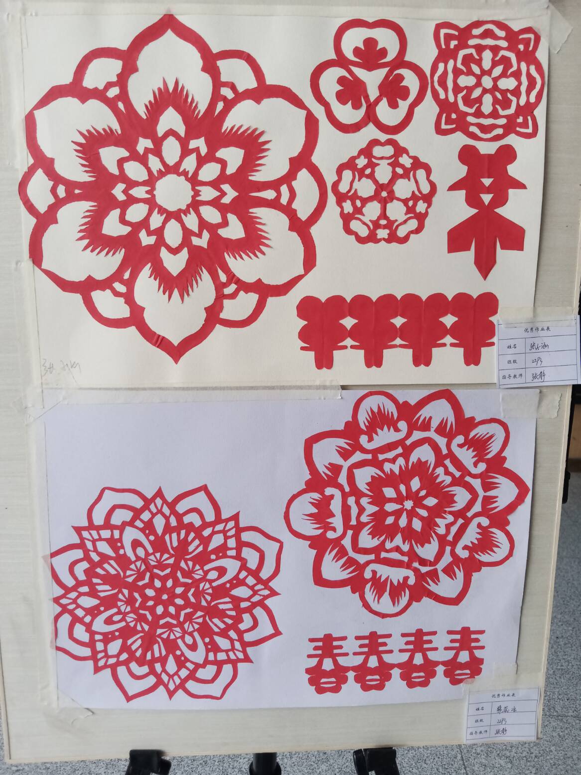 而剪纸展区更是热闹非凡。同学们在传统剪纸技艺的基础上大胆创新,将爱国情怀融入每一刀每一剪之中。通过精巧的剪纸手法,将祖国大地上和谐美好的画面定格,传递出对祖国人民幸福生活的美好祝愿。