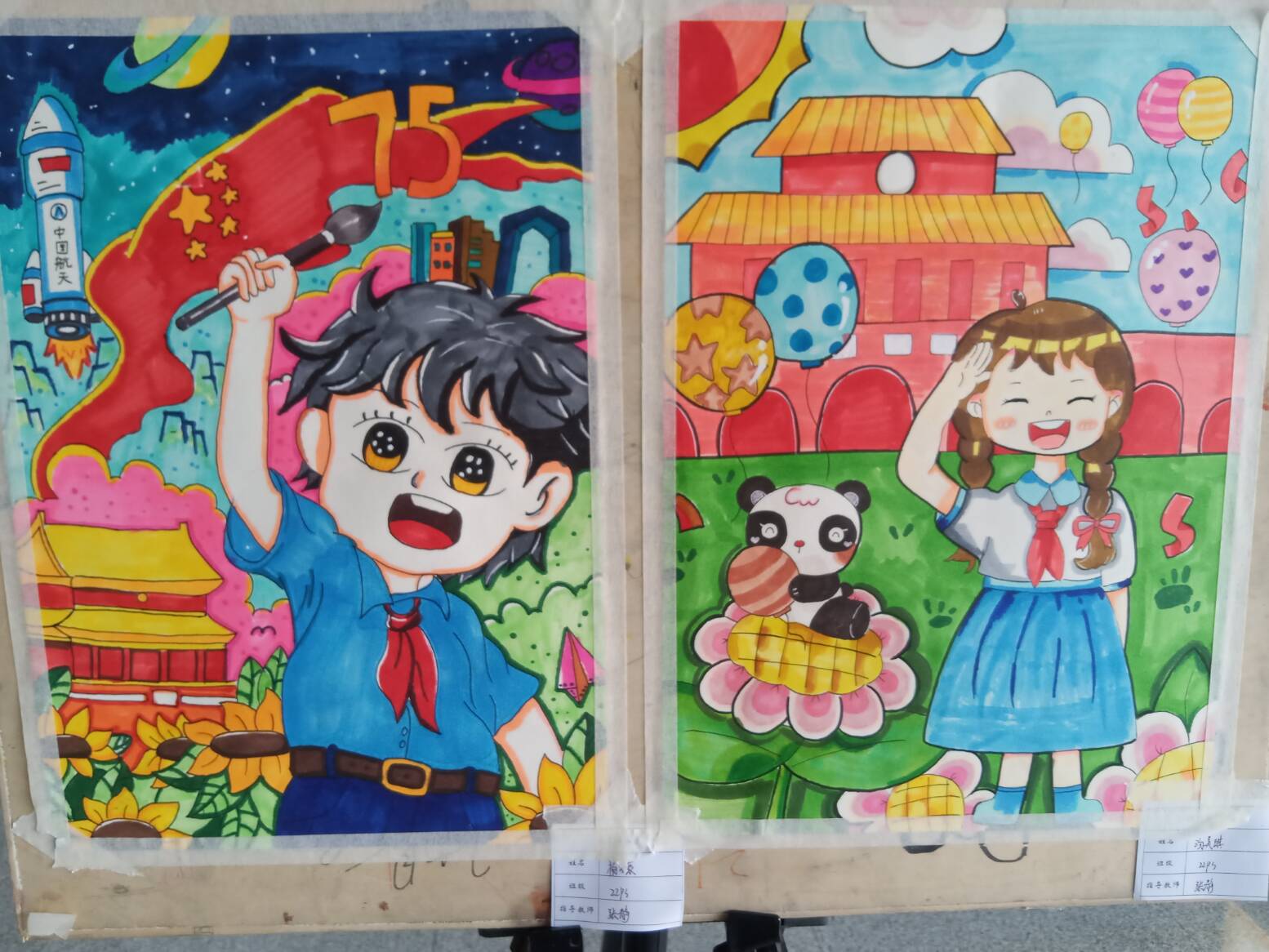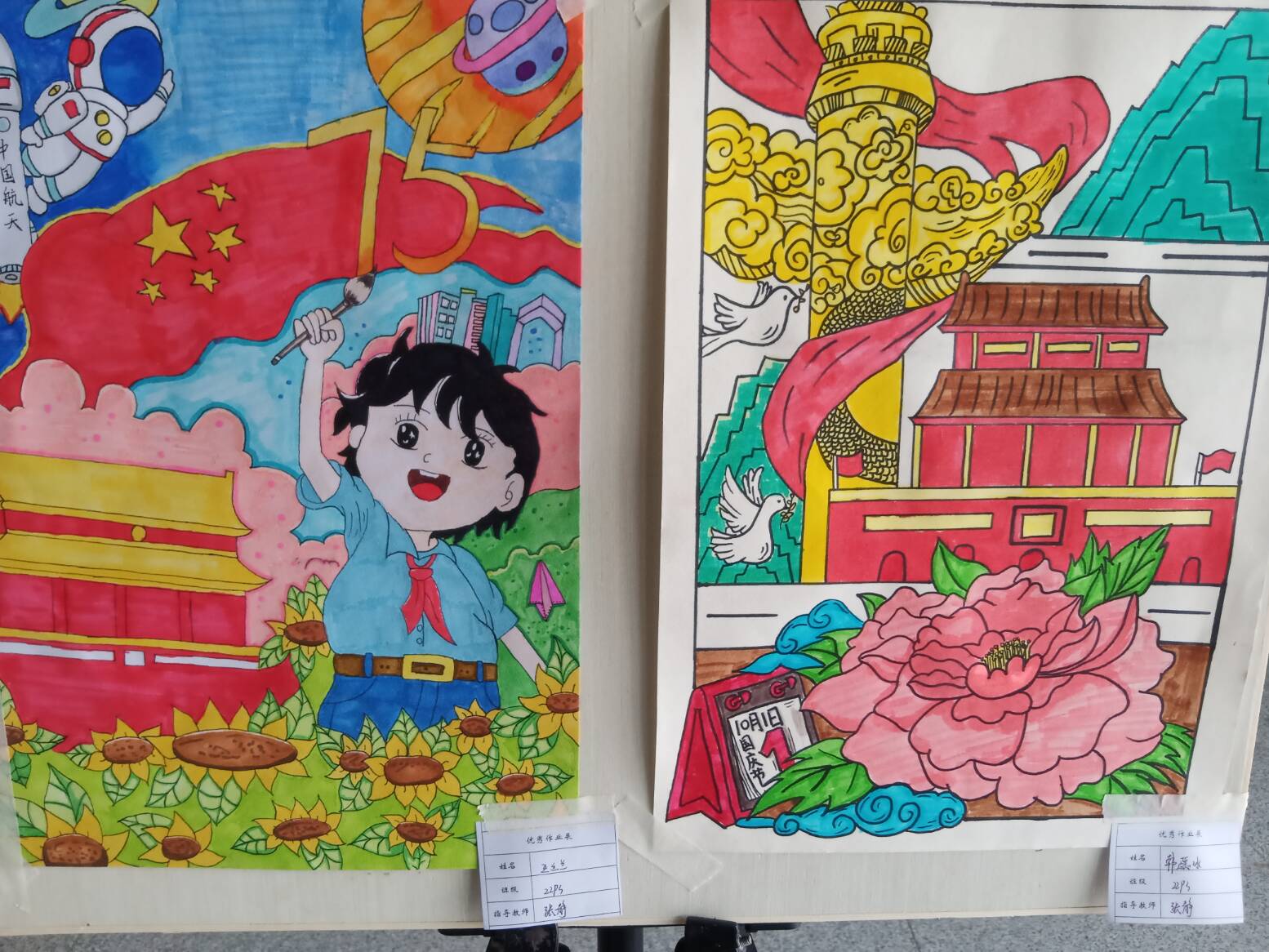 走进展览现场,一幅幅充满童趣与创意的作品让人眼前一亮。儿童画展区域内,22绘画普专3班的同学们用饱含深情的笔触描绘着心中的祖国,这些画作吸引了众人目光,画面中灯火辉煌的城市夜景,高楼大厦林立,街道上车水马龙,霓虹灯闪烁出五彩斑斓的光芒,生动展现了祖国现代都市的繁华,让人仿佛置身其中,感受着祖国蓬勃发展的活力。