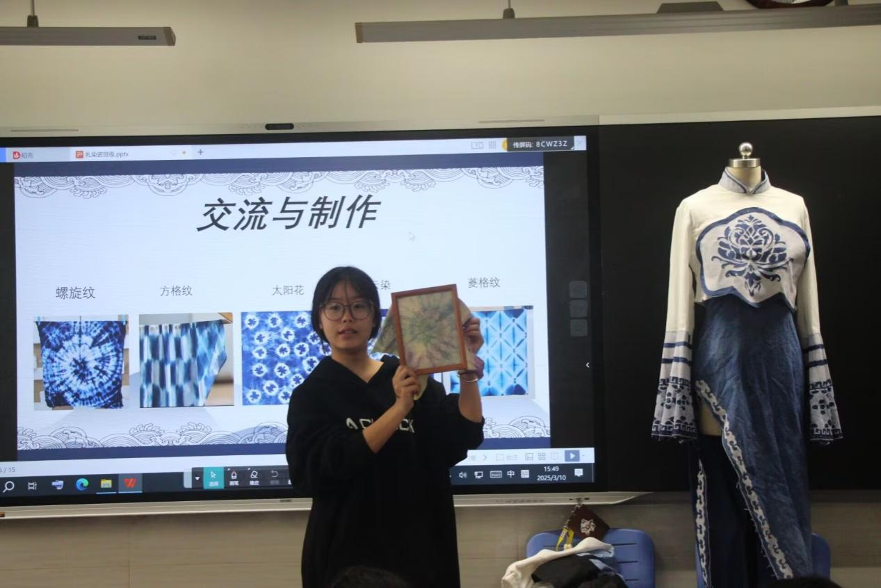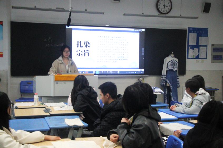 23服装高职1班的沈嘉妮同学借助图文并茂的PPT,向24级的同学们介绍了扎染的历史渊源与文化价值。她讲道:“扎染,古称‘绞缬’,起源于秦汉时期,兴盛于唐宋年间。它利用纱、线、绳等工具对织物进行扎结、浸染,最终能够形成各具特色的花纹图案。”同时,配合播放的大理白族扎染匠人传统工序视频,同学们仿佛置身于这项千年技艺的深厚文化底蕴之中,沉醉不已。