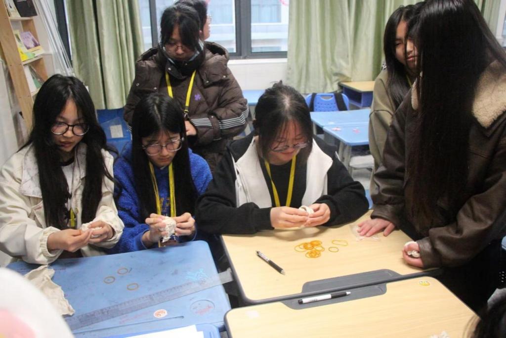 三个年级的同学运用扎染技法进行了现场操作。从折叠、捆扎、浸染、氧化到拆解,每一个步骤都进行得有条不紊。白布在同学们们的巧手下,逐渐绽放出蓝白相间的美丽花纹,犹如一幅幅灵动的水墨画卷,赢得了现场阵阵惊叹。同学们纷纷化身“小匠人”,亲身体验扎染制作的乐趣。有的同学将布料折叠成几何形状,用皮筋固定;有的同学则利用木夹、冰棒棍等工具创作出波浪纹路;更有同学大胆尝试“自由扎”技法,探索抽象图案的无限可能。