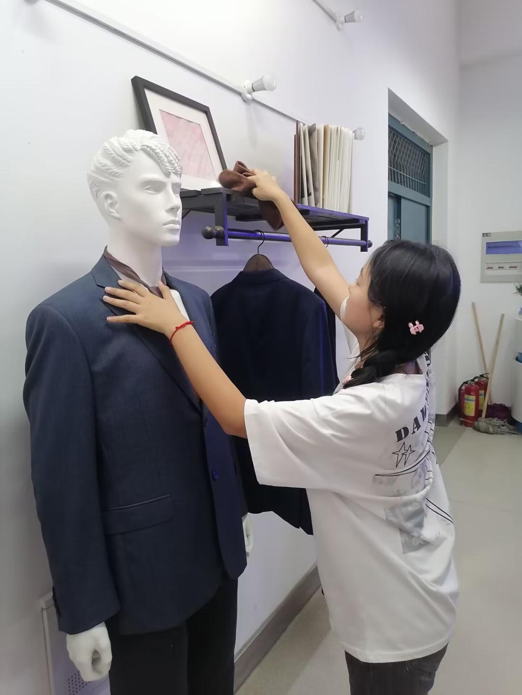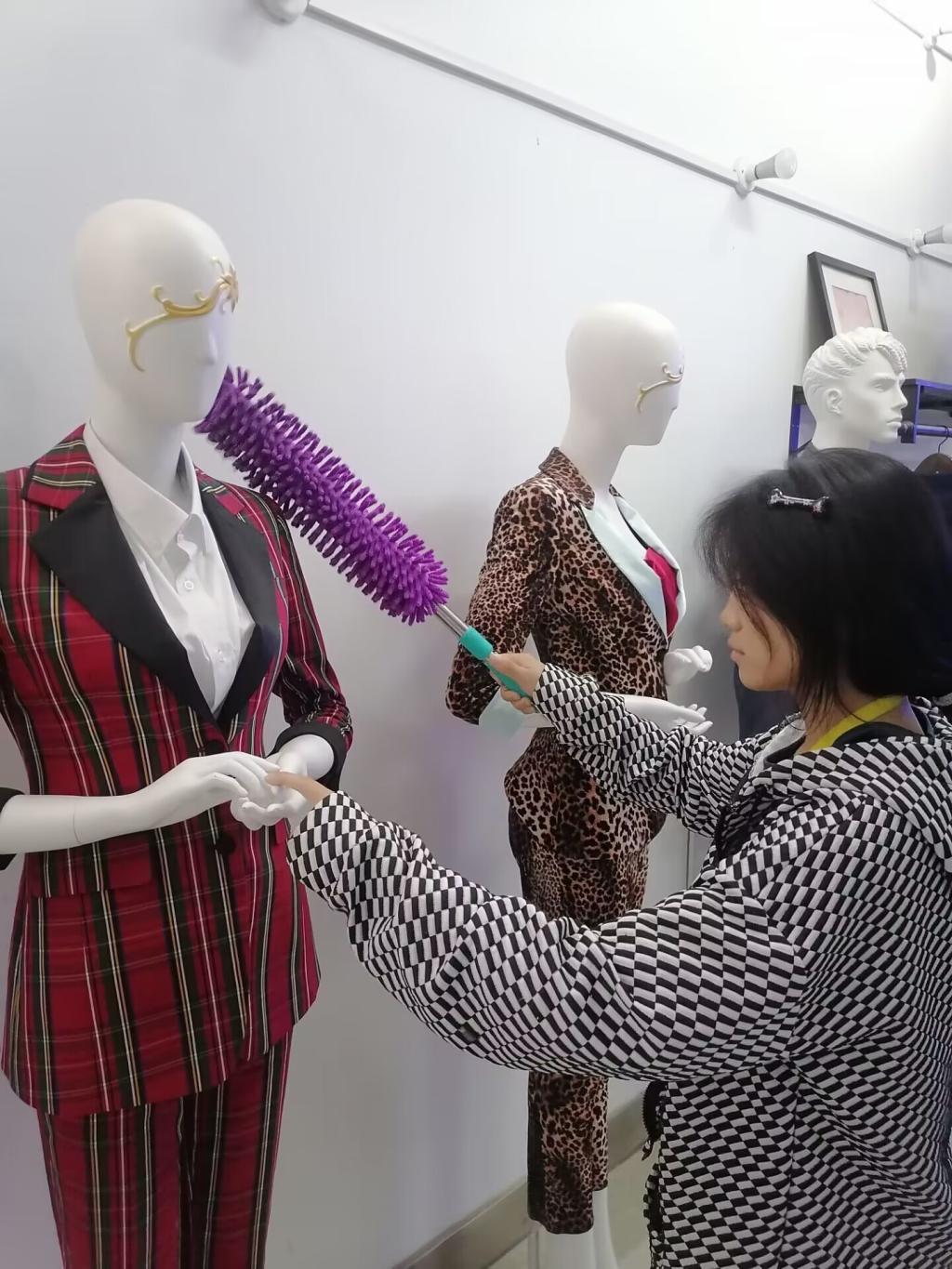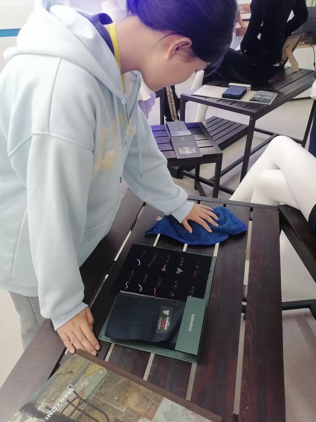 同学们在活动负责人的带领下,有序进行对衣物柜台的打扫。对教室进行细致分工后,同学们立即对柜台进行细致全面的清洁,实训室内处处涌动着忙碌的身影。同学们不畏劳累,为学习环境的整洁明亮的环境辛勤劳动,挥洒着自己的汗水。